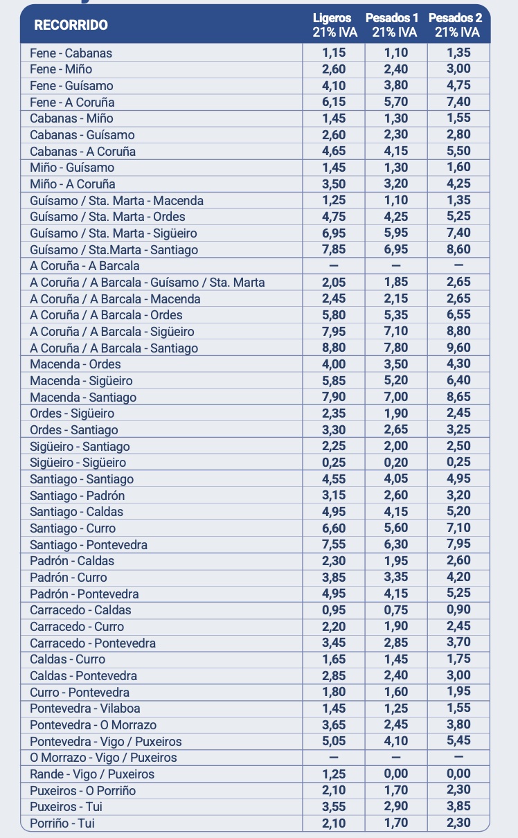 Sen contar as bonificacións sucesivas que se foron aprobando nos últimos anos en todas as autoestradas galegas, tanto estatais como autonómicas, estas son as novas peaxes para 2026.
