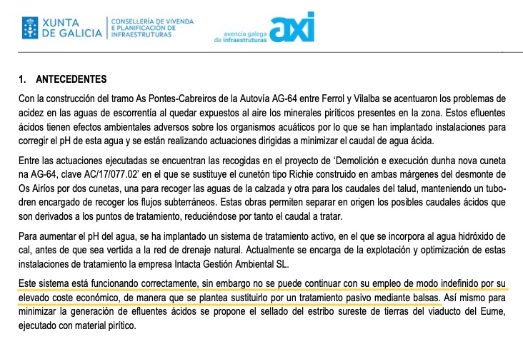 Hai dúas décadas a Xunta construíu a autovía Ferrol-Vilalba (AG-64) cunha incompleta avaliación ambiental que impediu detectar a tempo que o terreo polo que pasaría ao sur das Pontes, ao quedar descuberto, faría moi ácidas as augas do río Eume e mataría os seus peixes. Desde aquela a Consellería de Infraestruturas vén acometendo na zona todo tipo de custosas actuacións para paliar o problema.