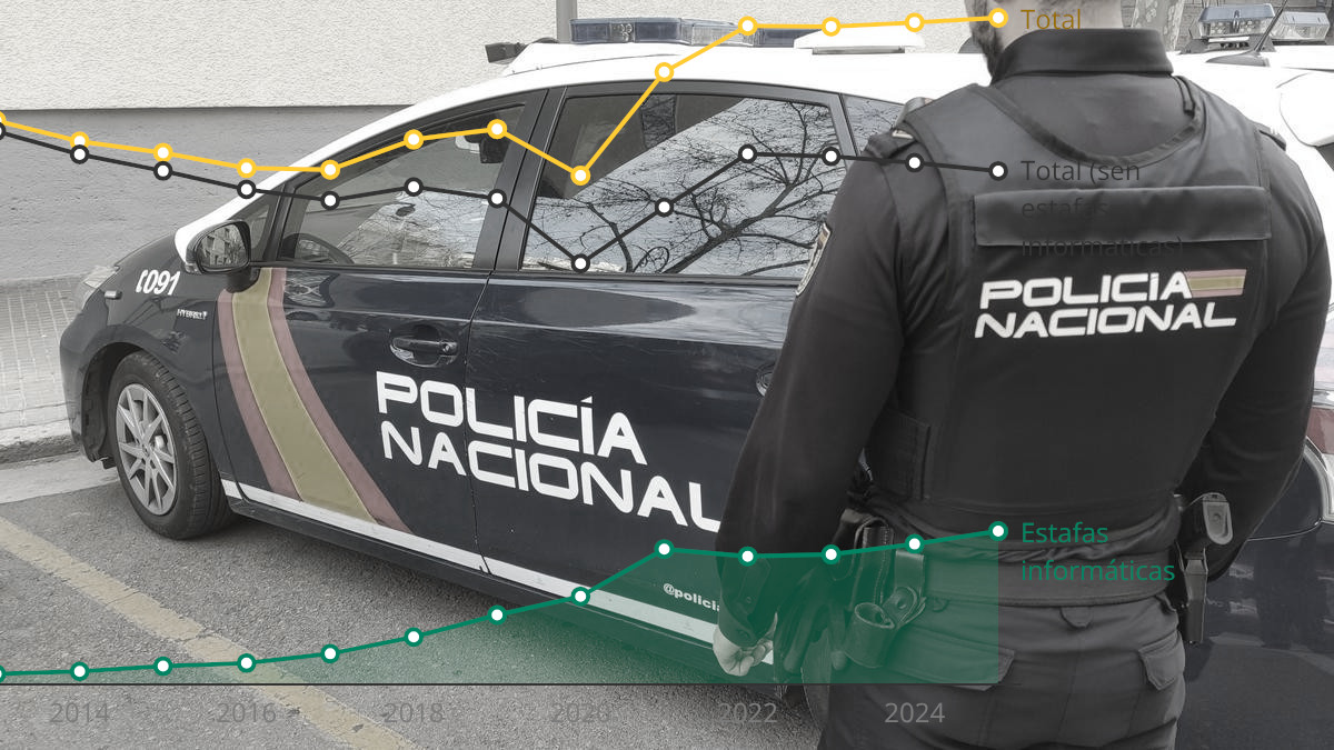 Se non se teñen en conta estas estafas informáticas, o resto de delitos descende (de 75.169 a 73.975), como leva facendo dende o ano 2022. En relación a ese ano 2022, o número de delitos convencionais descendeu en preto de 2.500, deixando as cifras en niveis do ano 2015.