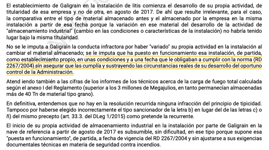Porén, os inspectores da Xunta consideraron que houbo "unha modificación da actividade xa que [Galigrain] implantou, desde a súa ocupación, novos almacenamentos industriais". E a xustiza coincide con esa visión salientando as "enormes diferenzas entre os dous materiais (cerámica fronte a gran) pois os produtos e materiais cerámicos son por esencia incombustibles" fronte á carga enerxética dos cereais almacenados que supuñan acadar "un nivel de risco máximo" de acordo coa normativa incumprida.