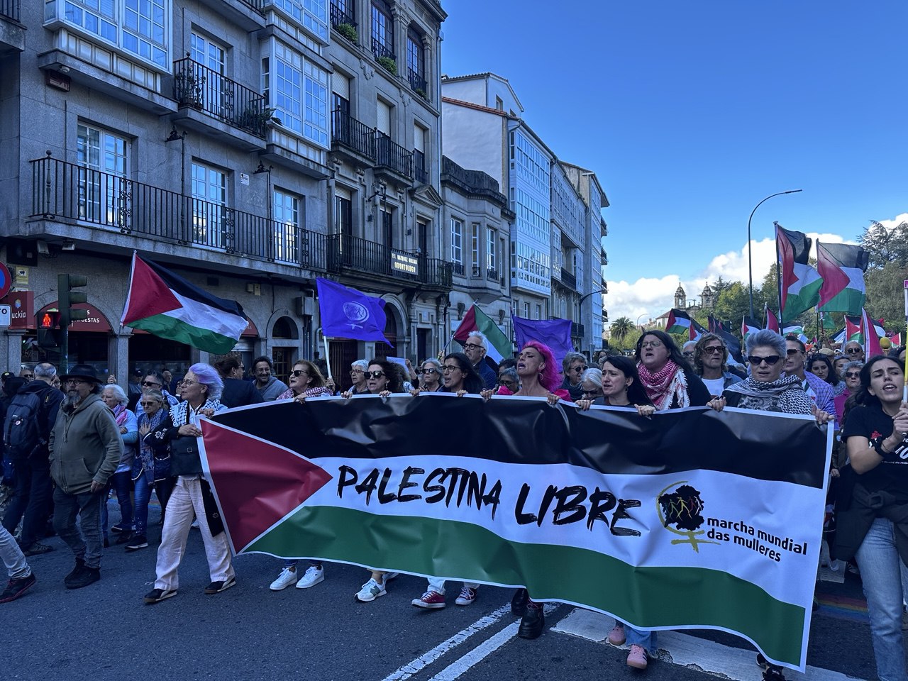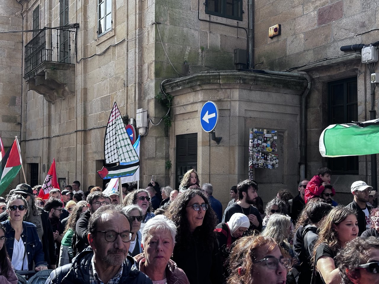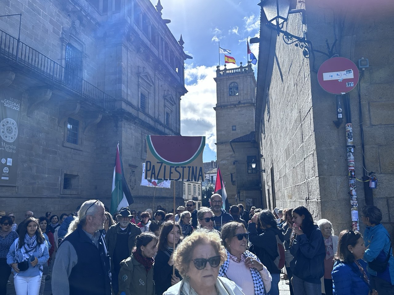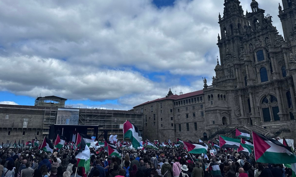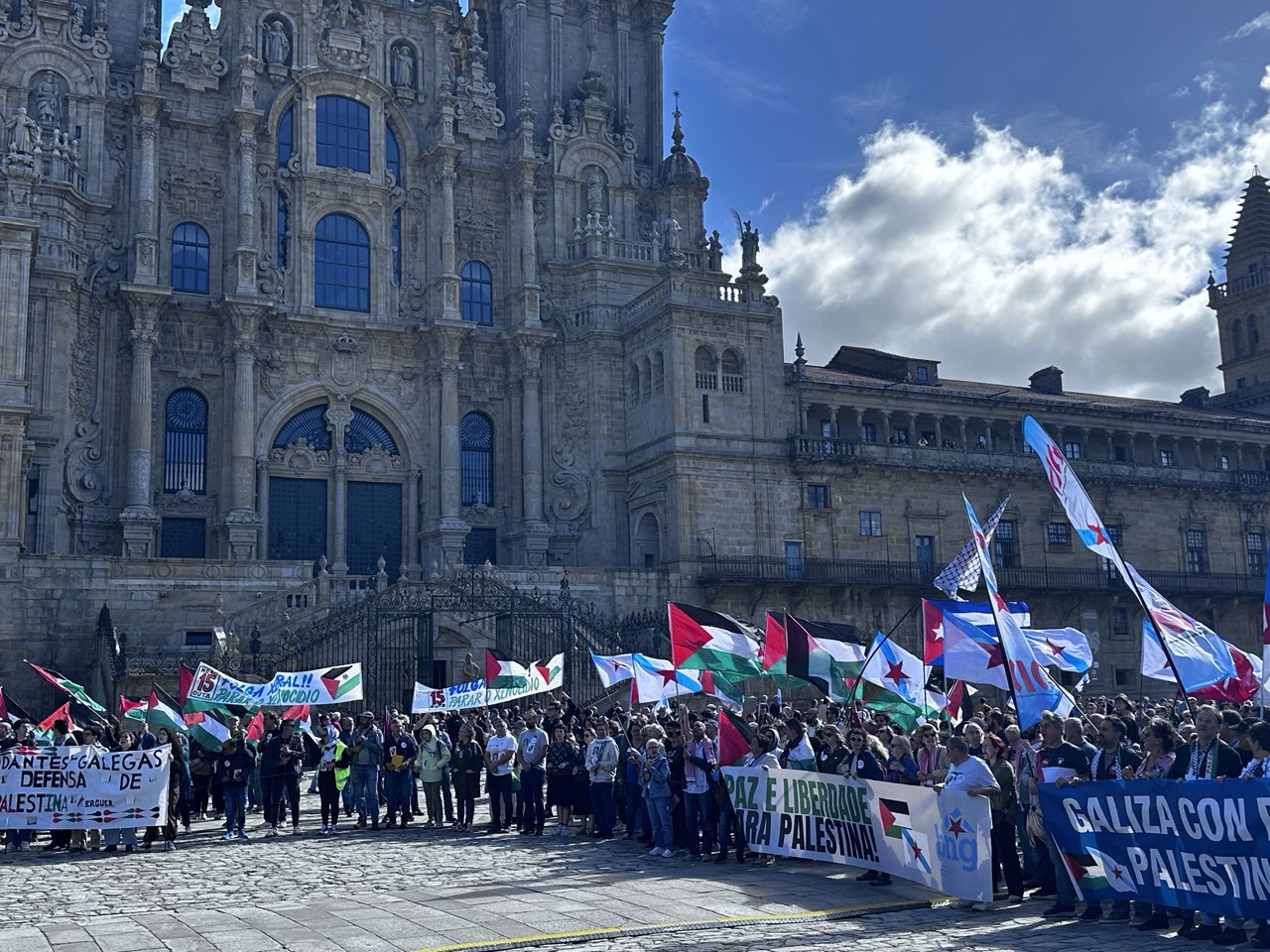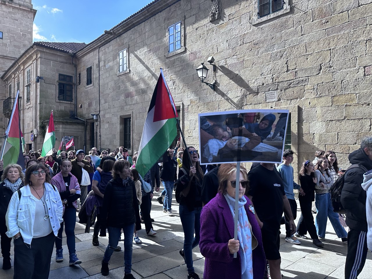 “Israel asasina, Europa patrocina”, “A crianzas de Gaza non son unha ameaza” ou “Onde están, que non se ven, as sancións a Israel” foron algunhas das consignas da manifestación por Palestina que percorreu Compostela acompañada dun amplo dispositivo policial. Cando o reloxo daba xa a unha e media da tarde, unha hora e media despois do comezo previsto da marcha, e cando a cabeceira acadaba a Praza do Obradoiro, a marea humana non acabara de saír da Alameda. Finalmente, a manifestación tivo que se dividir en dúas, a primeira pola Praza de Galicia e a outra pola praza da Policia (Rodrigo de Padron). Non foi ata pasadas as dúas e media da tarde cando entraban no Obradoiro as últimas manifestantes.