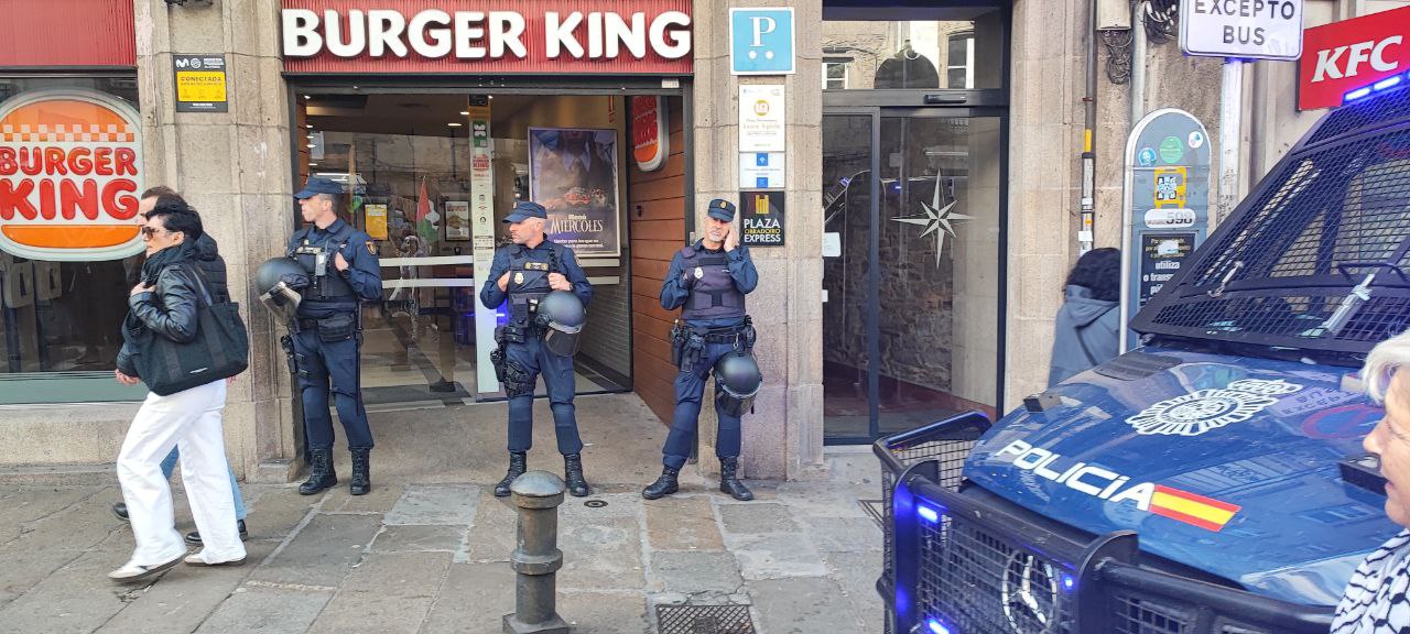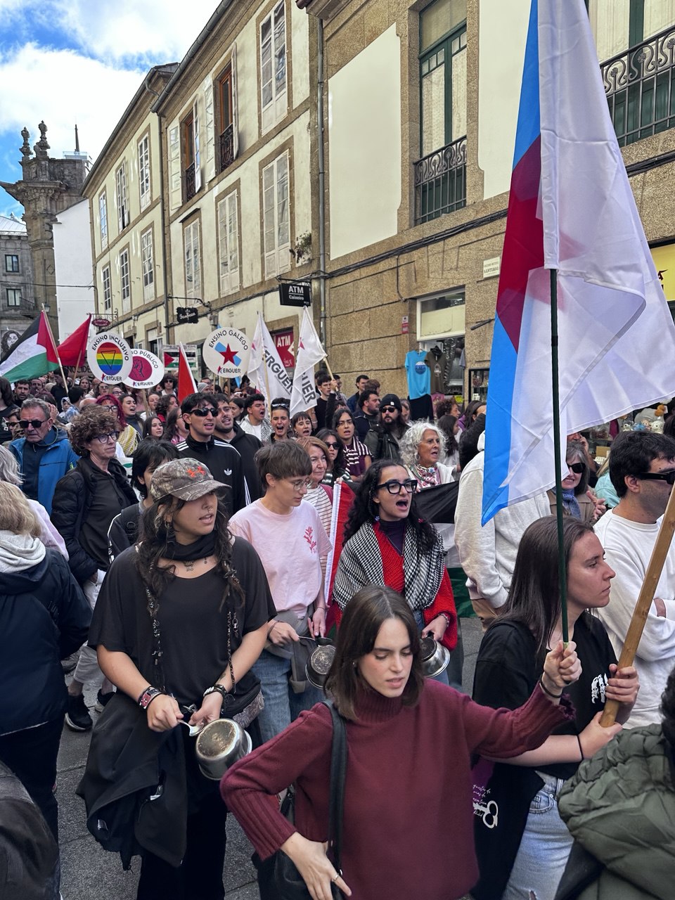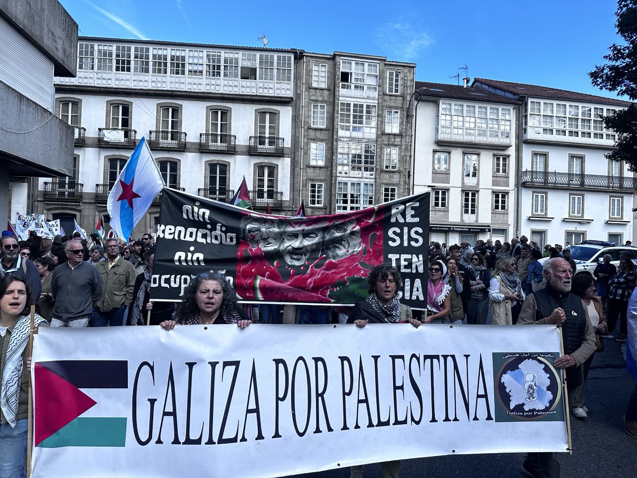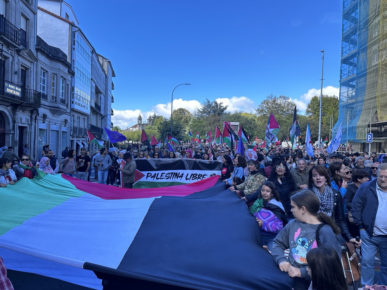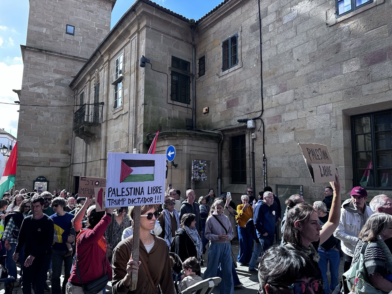 “Israel asasina, Europa patrocina”, “A crianzas de Gaza non son unha ameaza” ou “Onde están, que non se ven, as sancións a Israel” foron algunhas das consignas da manifestación por Palestina que percorreu Compostela acompañada dun amplo dispositivo policial. Cando o reloxo daba xa a unha e media da tarde, unha hora e media despois do comezo previsto da marcha, e cando a cabeceira acadaba a Praza do Obradoiro, a marea humana non acabara de saír da Alameda. Finalmente, a manifestación tivo que se dividir en dúas, a primeira pola Praza de Galicia e a outra pola praza da Policia (Rodrigo de Padron). Non foi ata pasadas as dúas e media da tarde cando entraban no Obradoiro as últimas manifestantes.