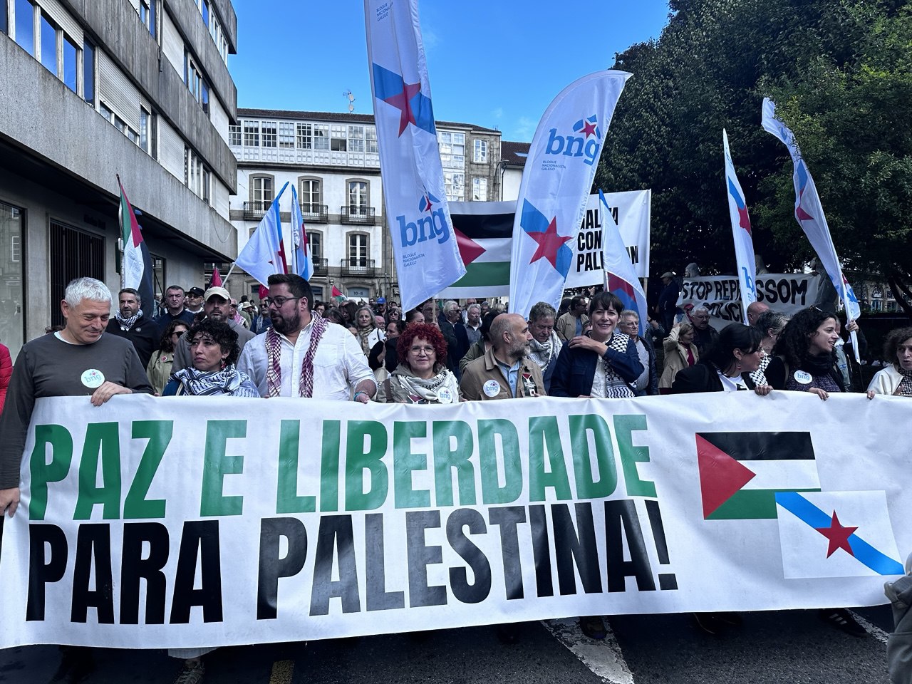 A portavoz nacional do BNG Ana Pontón, participou na protesta e subliñou o seu “inmenso orgullo” ante a mobilización da cidadanía galega a favor do pobo palestino e para denunciar con claridade que hai que parar o xenocidio que o Estado sionista está executando en Gaza con total impunidade. Unha dignidade, subliñou, que contrasta coa posición do goberno do PP, incapaz de condenar este xenocidio.