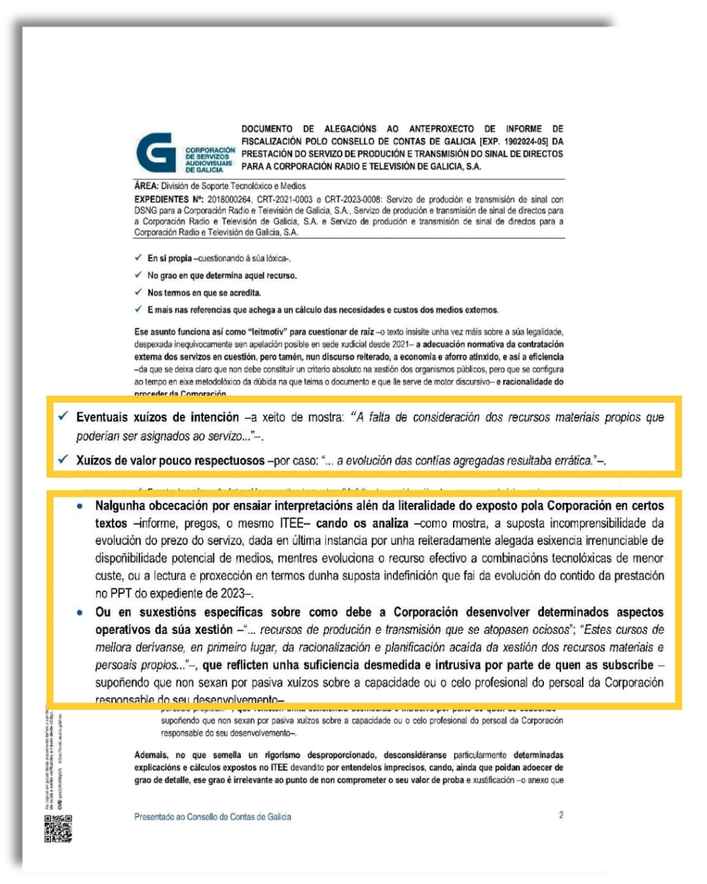 Pola súa banda, a dirección dos medios de comunicación públicos sinala a existencia de "eventuais xuízos de intención", "obcecación", "suficiencia desmedida e intrusiva" e "xuízos de valor pouco respectuosos" por parte do Consello de Contas no anteproxecto deste informe durante o habitual trámite de alegacións, como recolle o documento definitivo.
