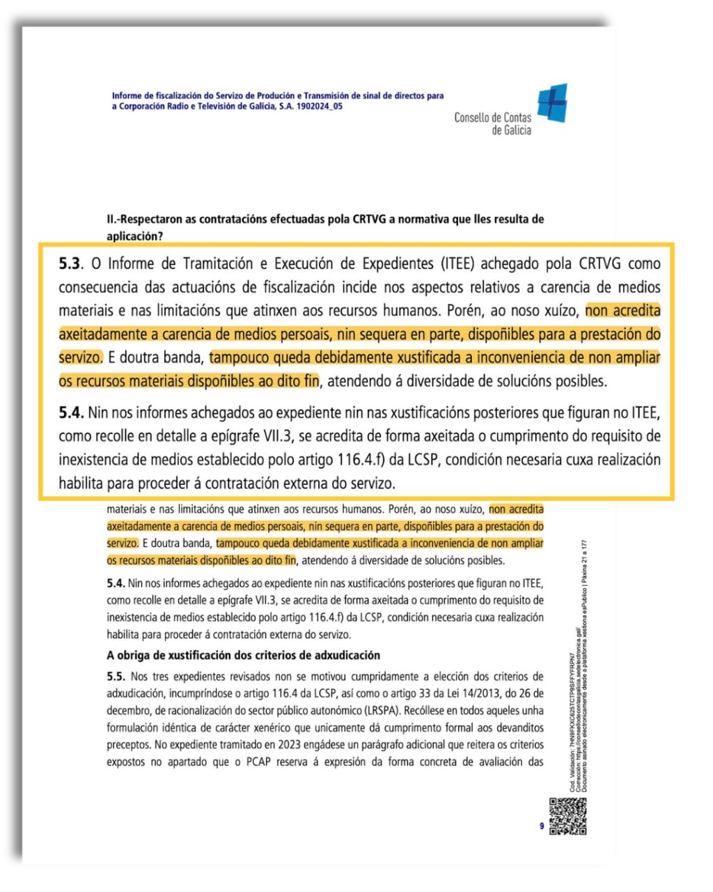 Tras analizar os contratos da Corporación de Servizos Audiovisuais de Galicia (CSAG) con produtoras privadas a este respecto, emite unha "opinión favorable con reservas" sobre o cumprimento da normativa de contratación pública. Fundaméntaa na "insuficiente xustificación da falta de medios persoais propios e da necesidade de recorrer a contratos externos para prestar o servizo".