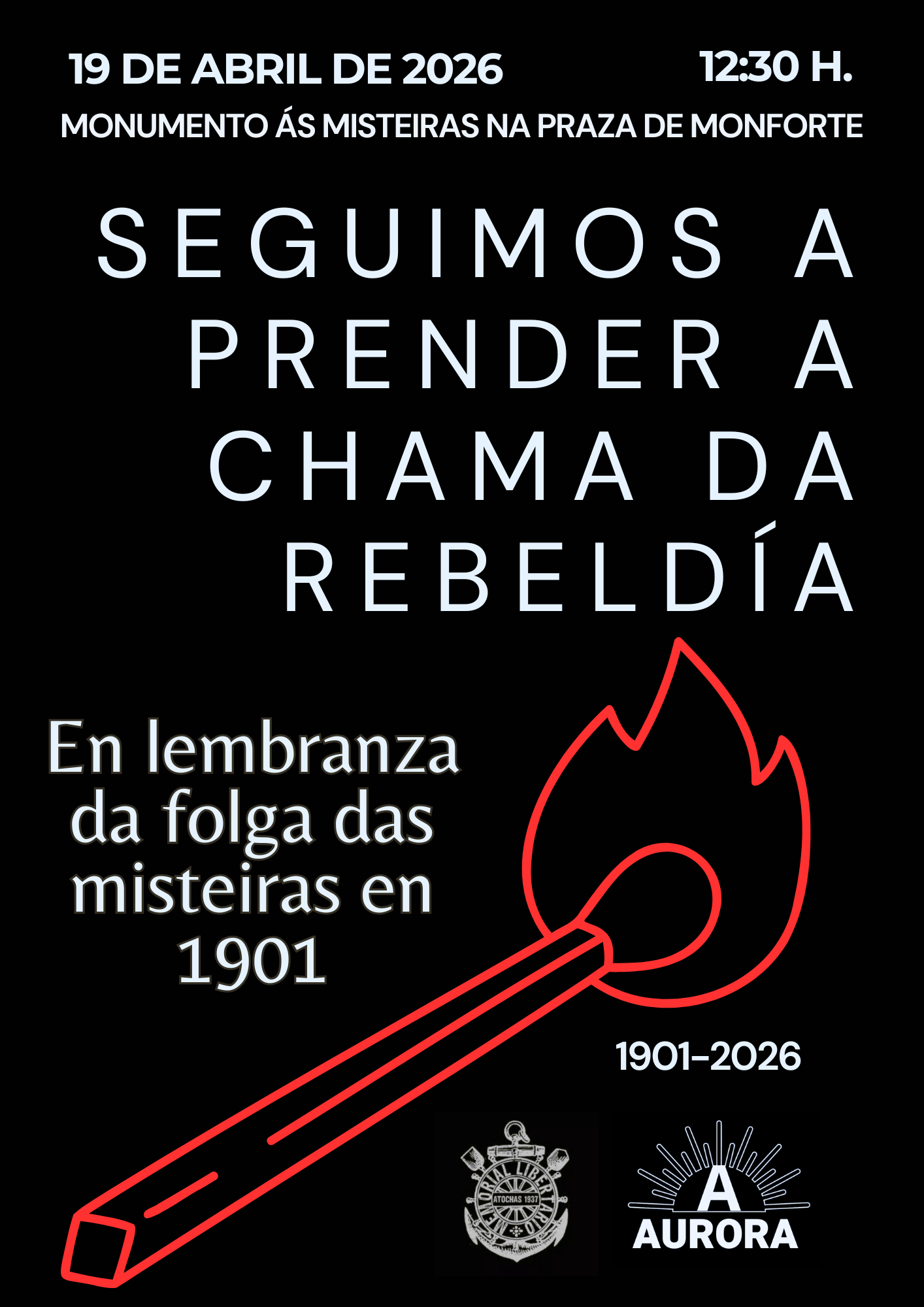 En lembranza destes feitos o Ateneo Aurora e o colectivo Refuxios da Memoria convocan para este domingo 19 de abril, ás 12.30 horas, unha homenaxe ao pé do monumento ás misteiras situado na praza de Monforte da Coruña. O acto forma parte dun programa máis amplo de actividades impulsado por unha comisión de entidades entre as que tamén se atopan os sindicatos CGT e CNT, organizacións libertarias como Xesta e Naide e a editorial anarquista Bastiana.