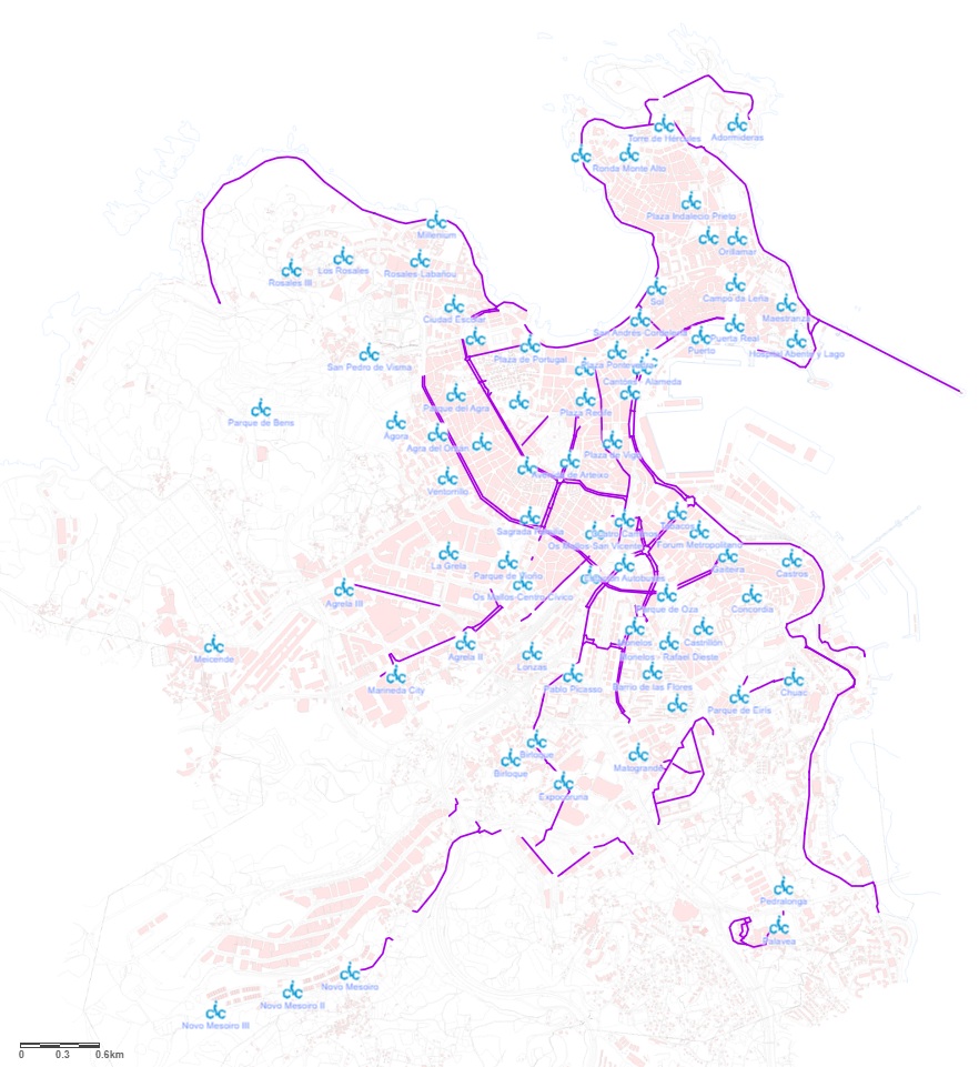 A rede de vías ciclables comezou a medrar e hoxe chega a 45 quilómetros en todo o termo municipal, unindo co centro e entre si todos os barrios da cidade. Tamén o fixo o número de estacións: das 24 existente en 2022 pasouse a 35 en 2023 e 49 en 2024. Na actualidade son xa 79 e o seu número medrará ata as 85 nos vindeiros meses. Tamén medrou o número de bicicletas dispoñibles, que hoxe son 650, 410 delas eléctricas.