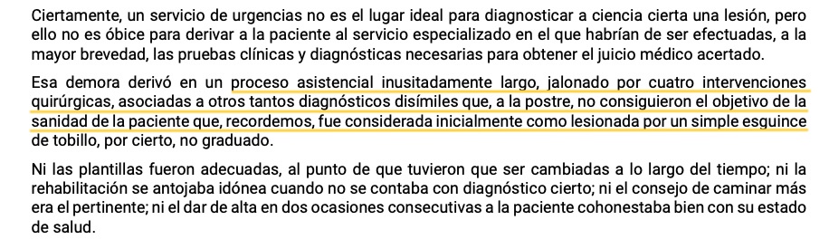 "Certamente, un servizo de urxencias non é o lugar ideal para diagnosticar de certo unha lesión, pero iso non é óbice para derivar á doente ao servizo especializado no que haberían de ser efectuadas, o máis axiña posible, as probas clínicas e diagnósticas necesarias para obter o xuízo médico acertado", sinalan os xuíces, os cales afirman que esa demora "derivou nun proceso asistencial inusitadamente longo, marcado por catro intervencións cirúrxicas asociadas a outros tantos diagnósticos disímiles que, finalmente, non conseguiron o obxectivo da sanidade da paciente que, lembremos, foi considerada inicialmente como lesionada por unha simple escordadura de nocello, por certo, non graduada".
