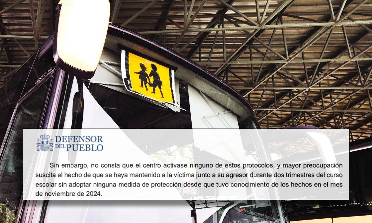 Segundo o caso agora revelado polo Defensor del Pueblo, o 15 de novembro de 2024 a dirección dun instituto de educación secundaria incoou un procedemento disciplinario a un alumno polo seu trato a outra alumna e con amparo na normativa xeral de convivencia escolar impuxéronse medidas correctoras que non se detallan. O 17 de marzo seguinte a dirección do centro incoou un novo procedemento "a raíz dun grave incidente acaecido no autobús escolar", o que derivou no traslado do agresor a outro instituto "ao inicio do terceiro trimestre do curso 2024/25", o que "implicou que o alumno abandonase a ruta de transporte escolar" da agredida.