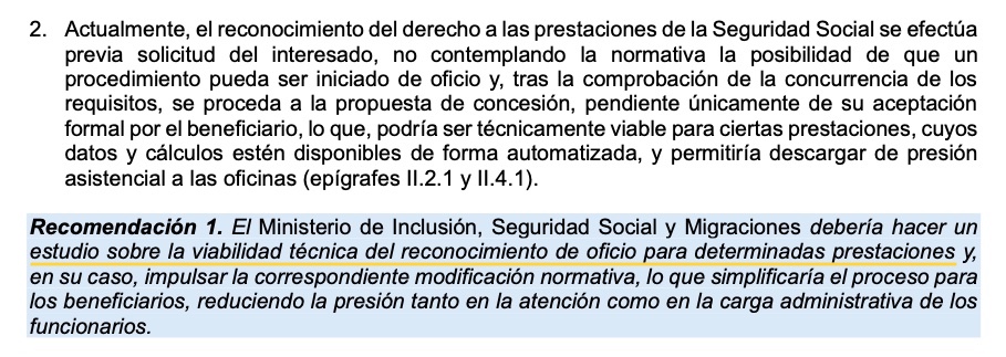 Ante as eivas detectadas en todo o Estado, o Tribunal de Cuentas emite diversas recomendacións de mellora á Seguridade Social: estudar a posibilidade de que determinadas prestacións sexan recoñecidas de oficio sen que a cidadanía teña que solicitalas, mellorar a formación do seu persoal, mellorar a información para colectivos vulnerables ou de atención urxente que poden ser atendidos sen cita previa ou actualizar a información dispoñible sobre as posibles canles de atención e trámites dispoñibles en cada unha delas.