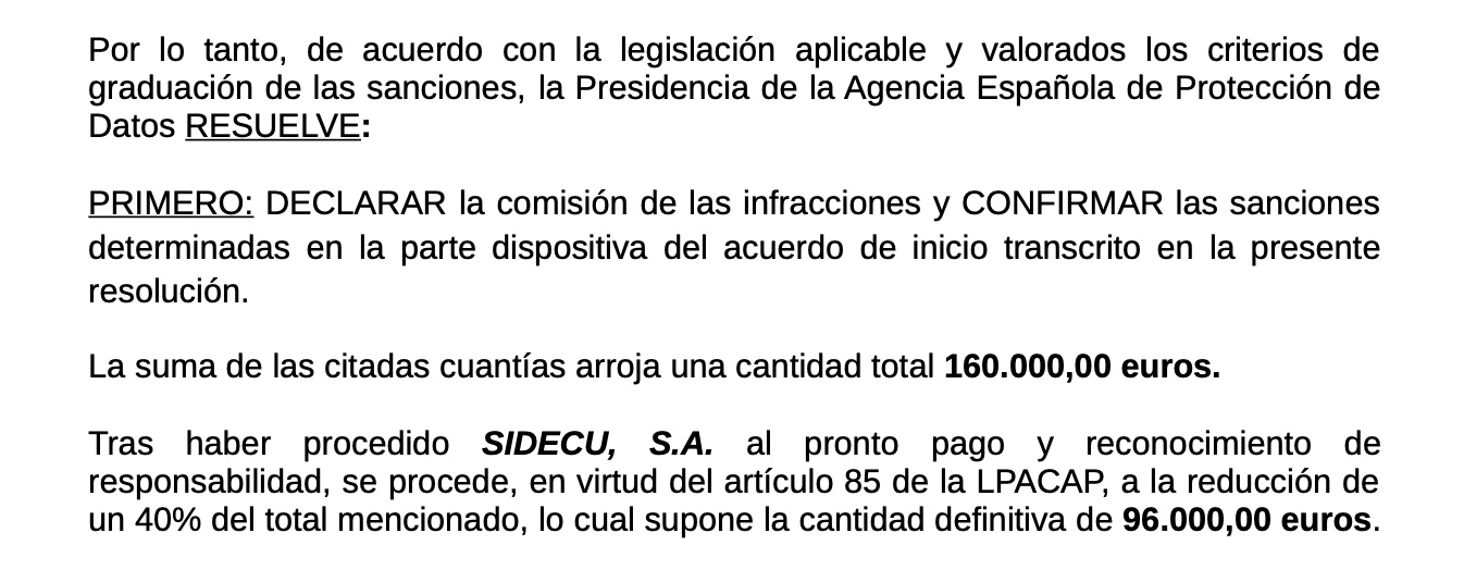 A Axencia Española de Protección de Datos (AEPD) vén de impoñer unha sanción á empresa Sidecu SA, con sede na Coruña e propietaria da cadea de ximnasios Supera, por impoñer nos seus centros un sistema de recoñecemento facial para o control de acceso da súa clientela. A sanción era de 160.000 euros pero "tras proceder Sidecu SA ao pronto pago e recoñecemento de responsabilidade" foi reducida a 96.000 euros.