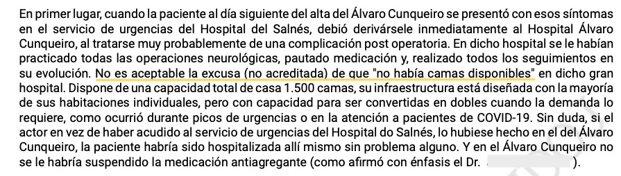 O xuíz, baseándose en varias peritaxes de médicos expertos, considera que se a muller fose atendida no hospital vigués onde a operaran non se lle retiraría a medicación e evitaríase o ictus que sufriu. Segundo a sentenza, cando acudiu a urxencias no Hospital do Salnés "debeu derivarse inmediantamente ao Hospital Álvaro Cunqueiro, ao tratarse moi probablemente dunha complicación postoperatoria". Pero non se fixo e o xuíz considera que "non é aceptable a escusa (non acreditada) de que 'non había camas dispoñibles'" no Álvaro Cunqueiro.