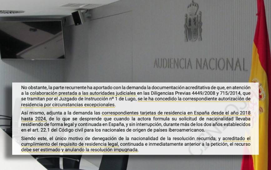 A lexislación establece que as persoas de Iberoamérica que soliciten a nacionalidade española só teñen que residir previamente en España de forma legal, continuada e sen interrupción durante dous anos. E ese foi o argumento dado polo Estado, que non cumprira co requisito de residencia previa legal durante dous anos, obviando o permiso extraordinario que obtivera pola súa colaboración coa xustiza. Así que agora a Audiencia Nacional anula a decisión do Estado "e no seu lugar recoñecemos a nacionalidade española por residencia á recorrente".