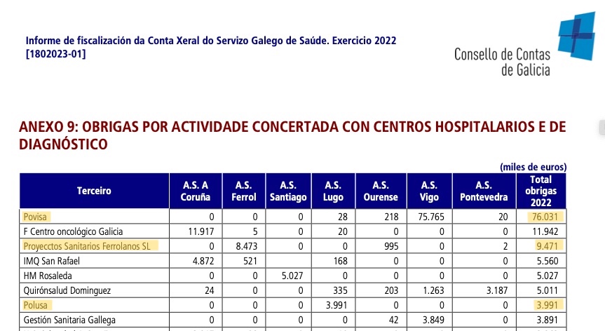 Segundo o último informe dispoñible do Consello de Contas cos importes detallados, en 2022 o Sergas concertou actividade con Proxectos Sanitarios Ferrolanos SL, a empresa a través da que Ribera Salud controla o Juan Cardona, por 9,5 millóns de euros. Ese mesmo ano a actividade concertada con Polusa ascendeu a 4 millóns de euros, aos que se engadiron outros 844.000 euros por contratos puntuais.