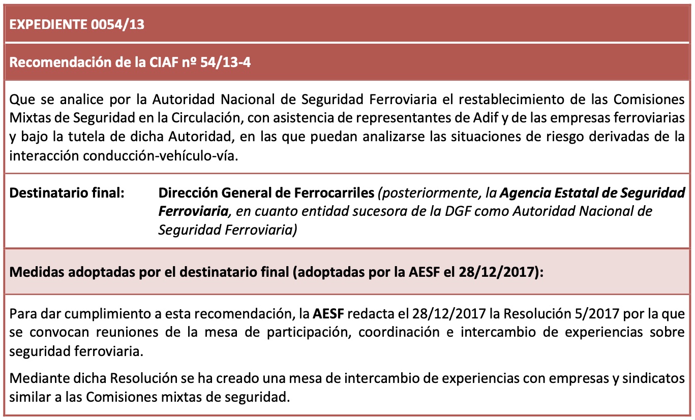 Para iso a Axencia Estatal de Seguridade Ferroviaria redactou en decembro de 2017 unha "recomendación técnica sobre comunicacións de propostas de mellora de seguridade" que dirixiu a todas as empresas "para que as comunicacións de seguridade realizadas polos seus empregados, de calquera nivel, sexan adecuadamente tratadas".