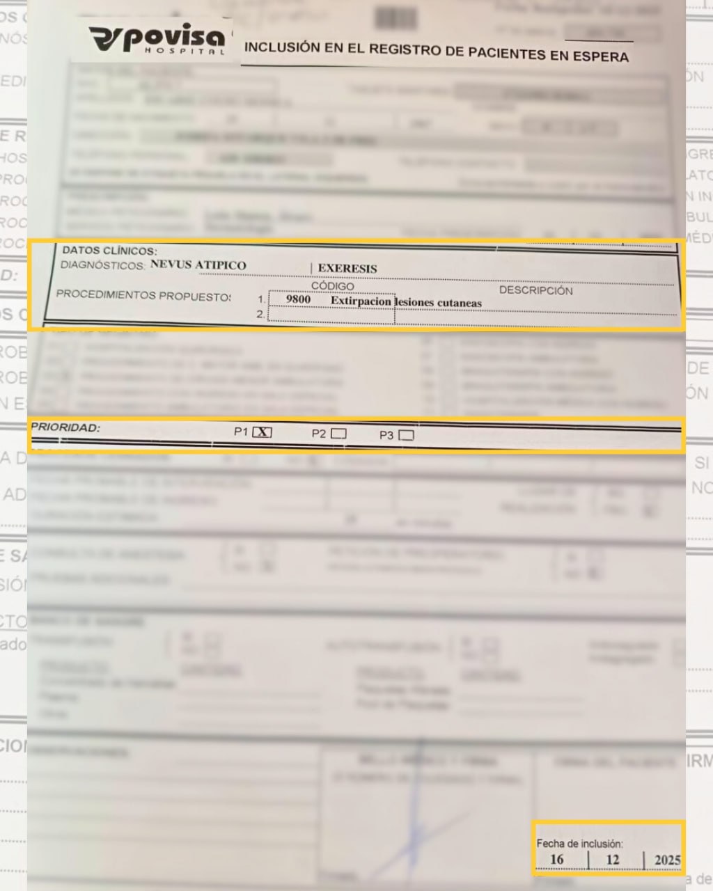 Este xornal tivo acceso ás reclamacións dunha paciente da área sanitaria de Vigo á que lle corresponde Povisa como hospital de referencia, que foi incluída no rexistro de pacientes en espera para a “extirpación” dun “nevus atípico” o 16 de decembro de 2025 coa prioridade máis alta tras unha revisión. “O dermatólogo díxome que como moito tiña que ser nos primeiros días de xaneiro e estamos en febreiro xa”, manifesta a afectada.