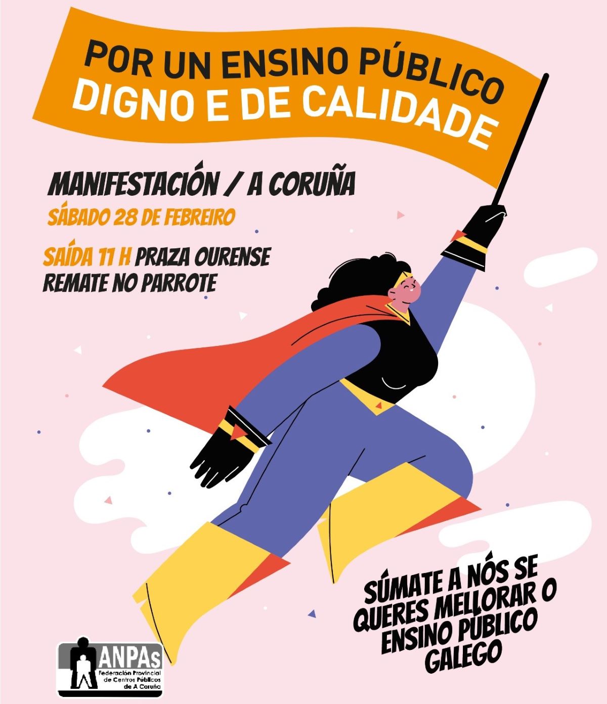 As continuas denuncias, mobilizacións e protestas que familias, alumnado e comunidades educativas de colexios e institutos públicos levan facendo polas numerosas eivas no funcionamento dos seus centros confluirán nunha gran marcha unitaria a nivel provincial. Será na Coruña, o vindeiro sábado 28 de febreiro, nunha manifestación por parte da Federación de Asociacións de Nais e Pais (ANPAs) e AFAs (Asociación de Familias de Alumnos) ante a "situación de deterioración e falta de recursos que afecta á escola pública".