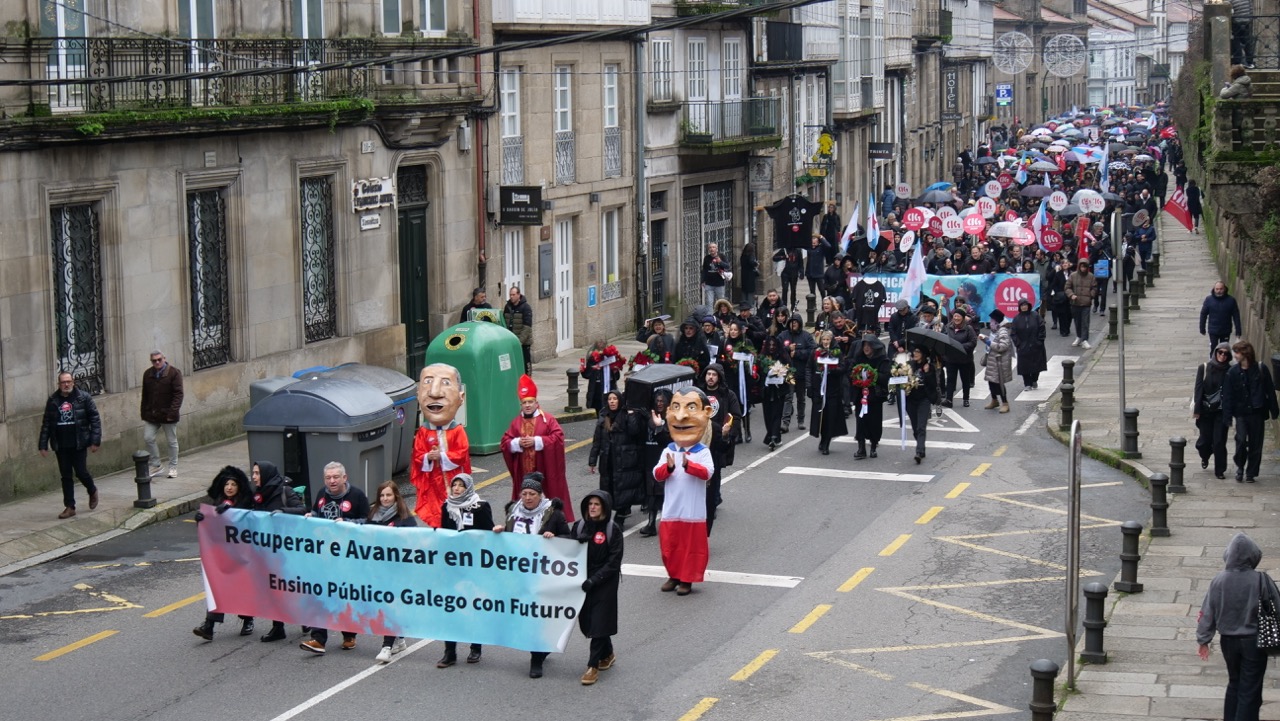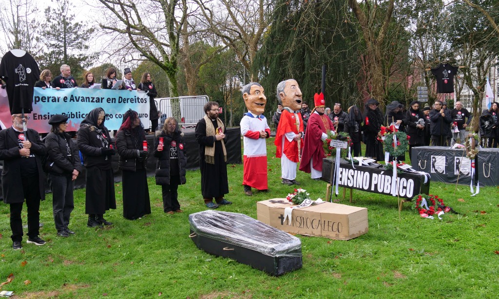Despois das máis de vinte "marchas fúnebres" por toda Galicia que tiveron lugar este martes, o profesorado en folga escenificou este mércores o "velorio" do ensino público galego dende o Parlamento –"onde aprobaron os Orzamentos para 2026 sen ningunha modificación en Educación", salientan CIG-Ensino e STEG– ata o edificio central da Xunta en San Caetano.