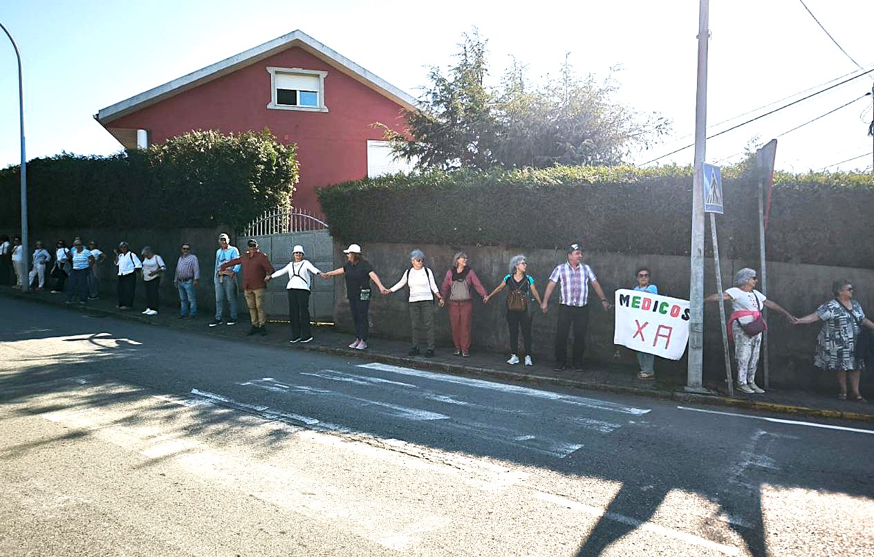 "A política de recursos humanos baseada na precariedade contractual, nos salarios indignos e na sobrecarga laboral leva a que moitos profesionais se vexan obrigados a marchar ao estranxeiro onde son máis respectados e valorados”, expresaron tras repasar os recortes e eivas que na sanidade pública sofren diferentes concellos da comarca, de onde chegaron veciños e veciñas para participar na cadea.