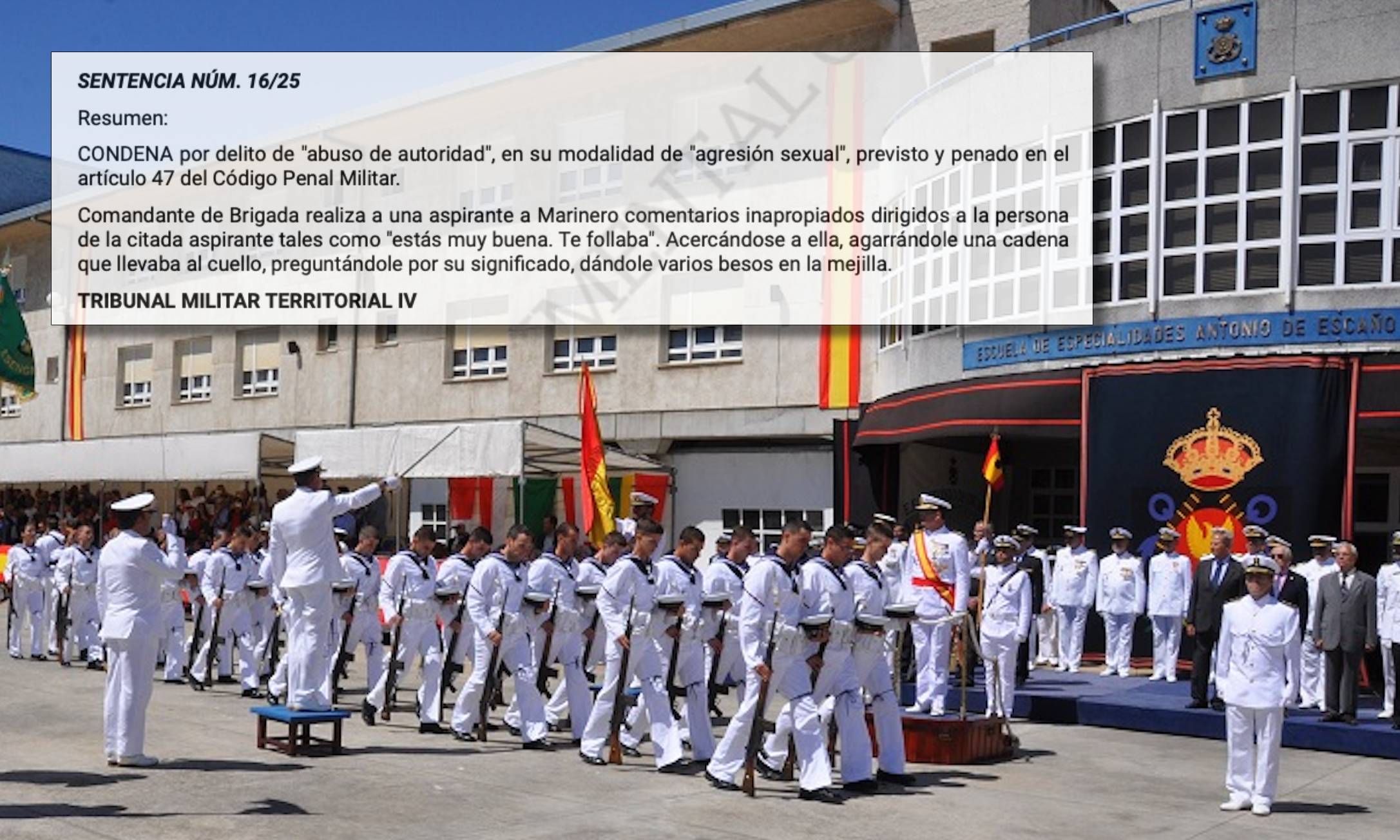 O pasado 11 de novembro, logo de que o Poder Xudicial fixese pública a daquela última sentenza, Praza.gal recompilou os cando menos tres casos de agresión sexual con condena firme rexistrados nos últimos anos na Escola de Especialidades da Armada Antonio de Escaño de Ferrol. Apenas uns días despois, e ás portas deste 25-N, día internacional contra a violencia contra as mulleres, o Poder Xudicial vén de facer pública unha nova sentenza firme, a cuarta en tres anos, esta por acordo entre acusado e Fiscalía, que condena un tenente de navío e comandante de brigada por "contactos físicos non consentidos" cunha alumna á que dixo "estás moi boa, fodíate".