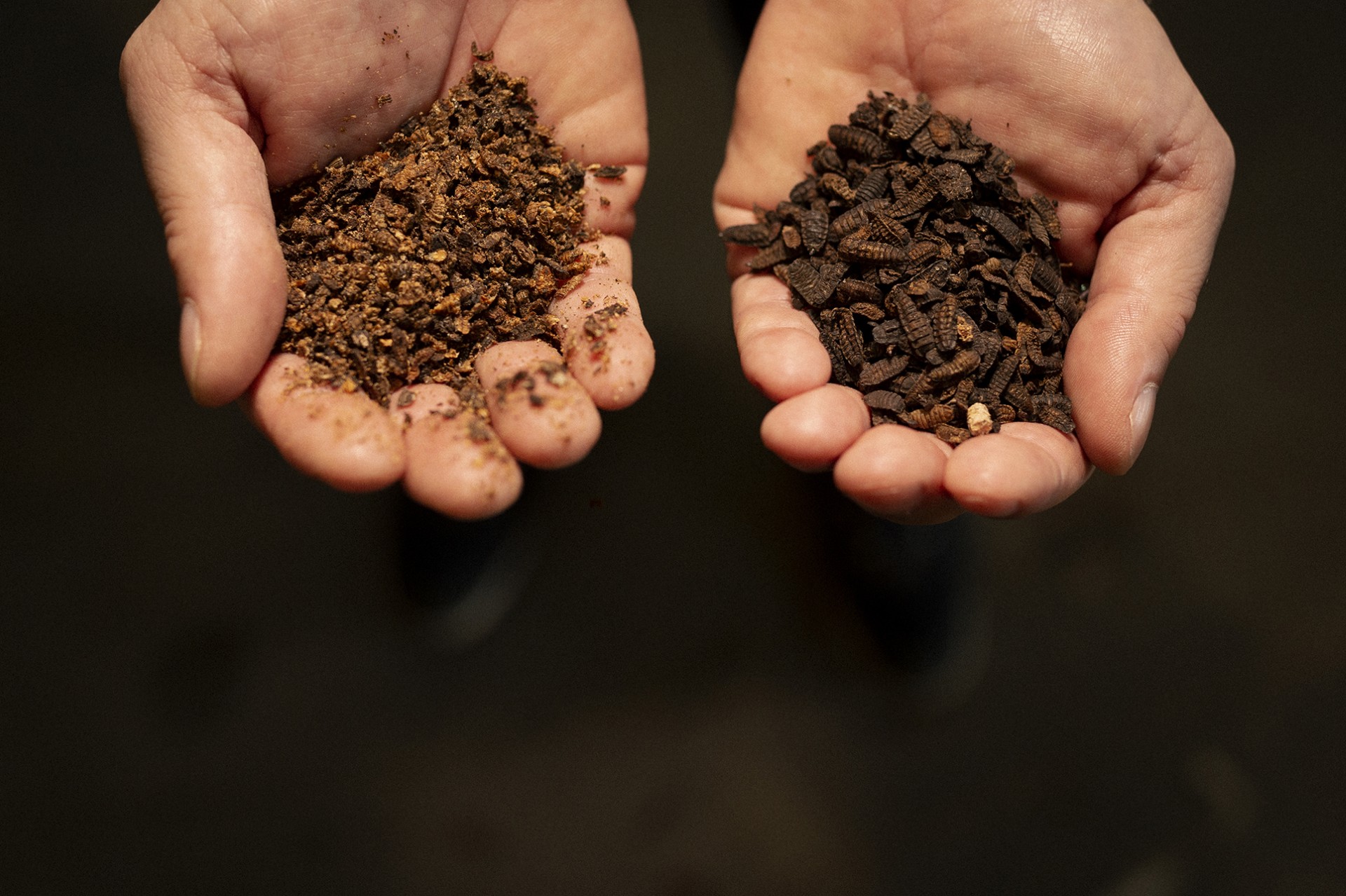 A larva seca obtense do secado case completo da larva fresca, e é un produto altamente proteico. A fariña obtense a partir de larva de mosca soldado negra desengraxada, e está indicada para a elaboración de pensos animais.