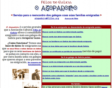 O portal contaba cun taboleiro de mensaxes a xeito de foro, un servizo de reencontro de familias emigradas (o Atopadoiro), un directorio das webs galegas que existían nese momento , recursos para aprender o practicar a lingua galega ou informacións de utilidade para quen desexase retornar
