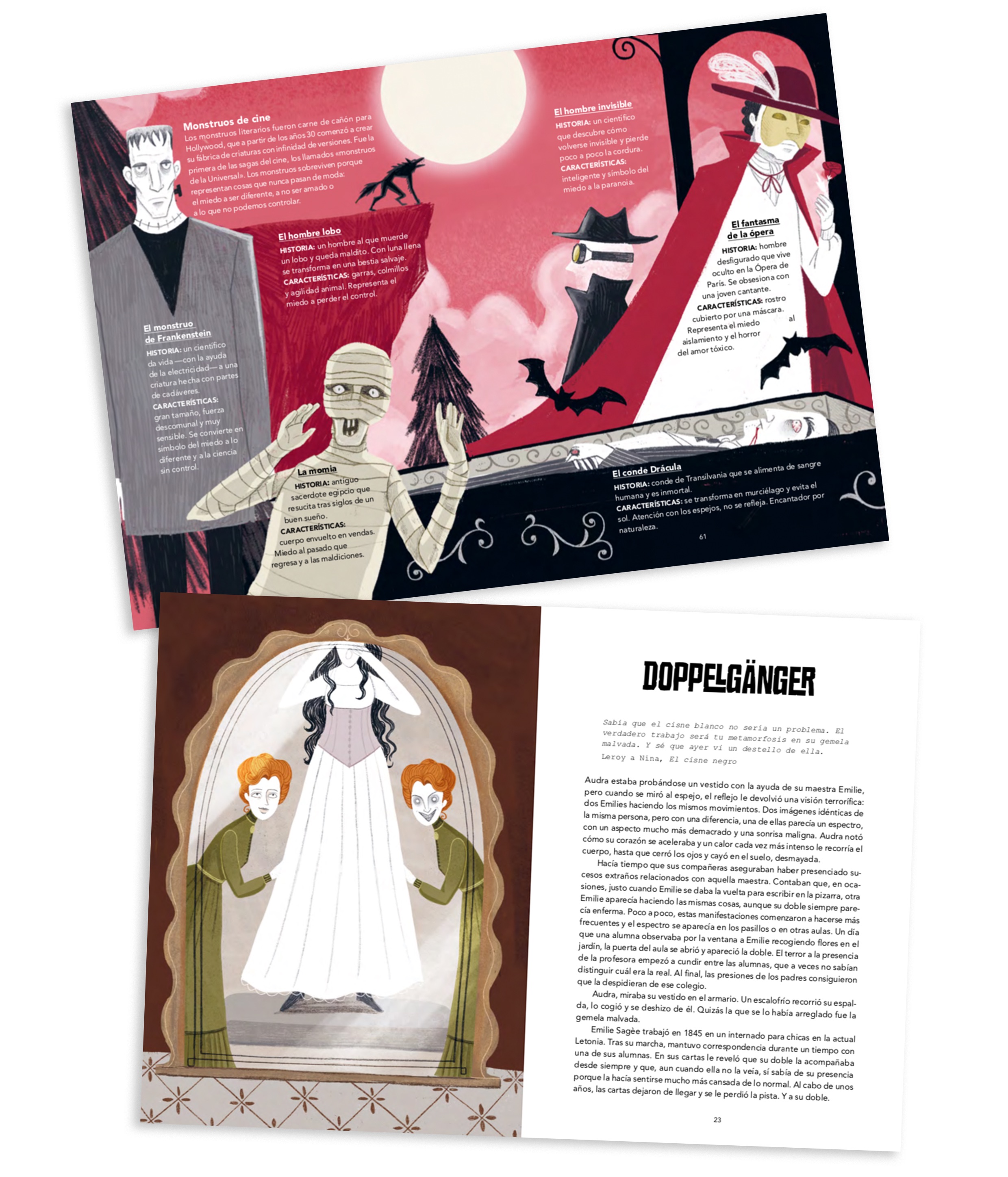 O cinema é protagonista dos seus libros anteriores como autora e ilustradora: El Gran Hotel Wes Anderson (Lunwerg, 2018), Alfred Hitchcock: el niño que filmó el miedo (Libre Albedrío, 2023) e Charles Chaplin: el pequeño vagabundo (Libre Albedrío, 2024). Pero tamén está moi presente aquí, películas e series serven para explicar medos e, ademais, para facerse cun feixe de recomendacións para ver.