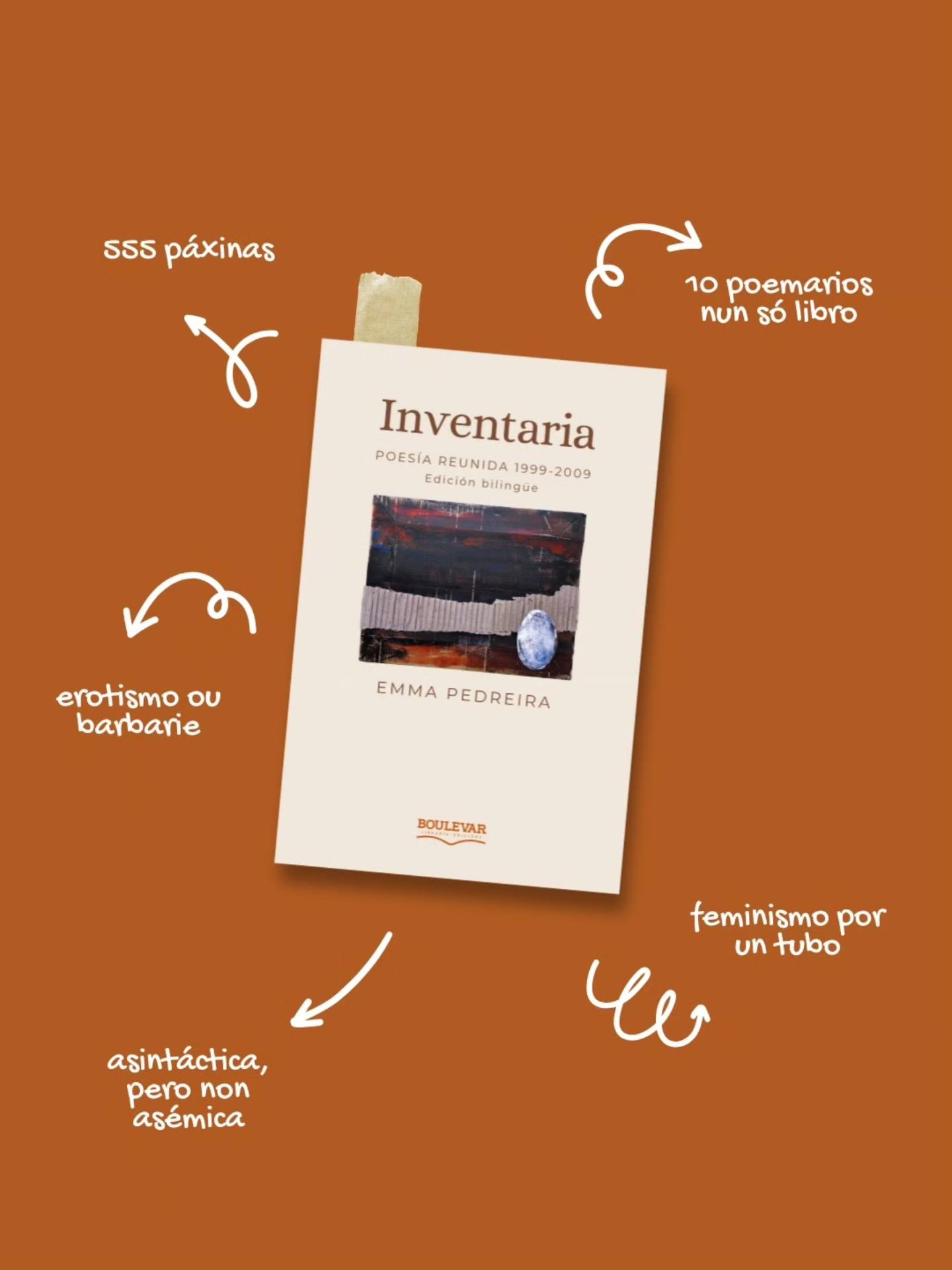 Boulevar Libraría Edicións vén de anunciar o lanzamento da súa primeira obra, Inventaria, unha poesía reunida en edición bilingüe de Emma Pedreira que abrangue os seus poemarios entre os anos 1999 a 2009