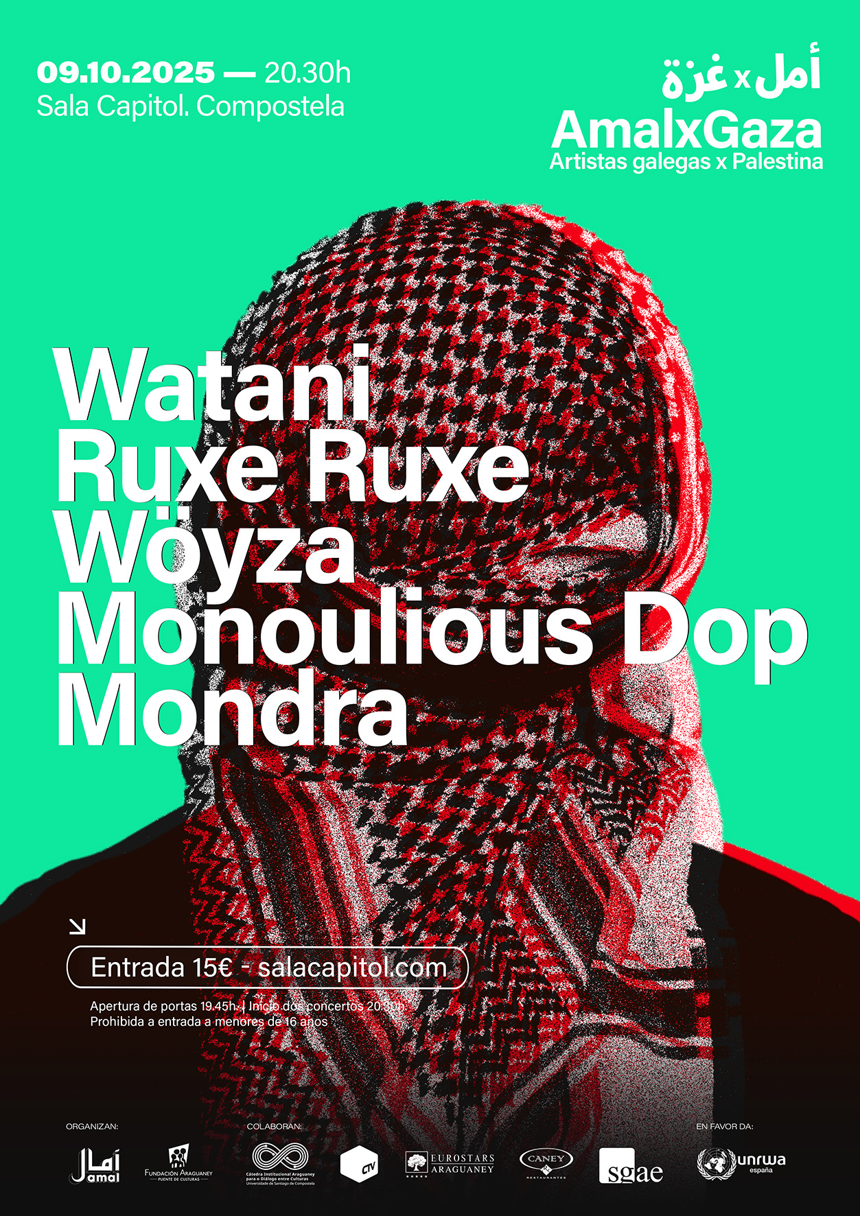 Será na Sala Capitol este xoves 9 de outubro a partir das 20.30 horas, nun evento que contará coa actuación de Mondra, Monoulious DOP, Wöyza e Ruxe Ruxe, así como coa participación do grupo de baile palestino Watani. As entradas, cun prezo de 15 euros, están a venda na web da Capitol e na Reixa Tenda. No despacho de billetes teñen un custo de 18 euros.