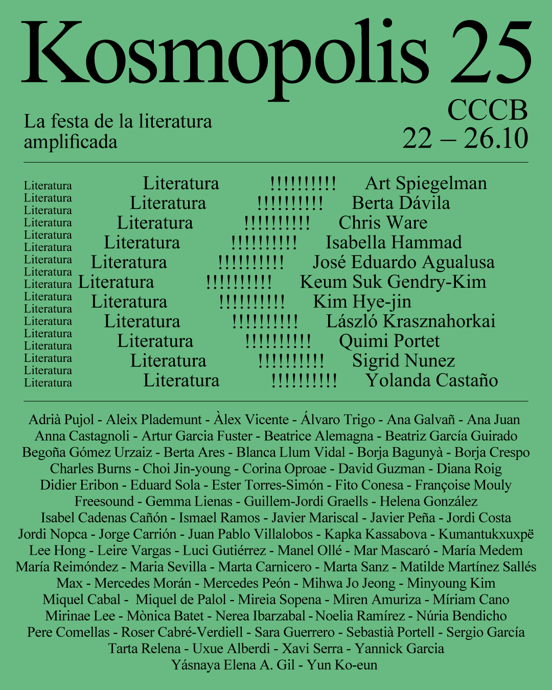 Aquí a literatura é a protagonista en todas as súas vertentes. Dende o CCCB explican que apostan "por un concepto de literatura amplificada, en todas aquelas manifestacións da palabra –oral, impresa e electrónica– que erosionan as divisións entre xéneros, asumen a evolución dos soportes de lectoescritura e sortean as sucesivas mortes anunciadas". O certame, de prestixio a nivel europeo, dedica na edición deste 2025, que se celebra do 22 ao 26 de outubro, unha importante parte da programación ás creadoras e creadores galegos que están a destacar polas súas aportacións á Cultura.