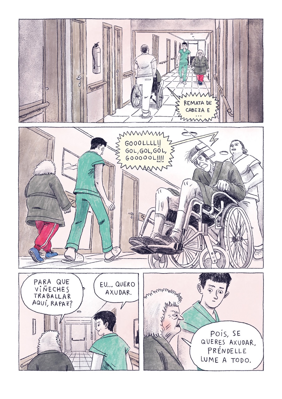 Quería que houbese como unha transición das páxinas que son na residencia, nas que empreguei máis grises e cores apagadas, ao resto da historia na que Adelina se vai achegando á súa casa, onde xa as cores son máis vivas. Por outra banda, como son de Belas Artes e me dá moita rabia que se estereotipen as cores, empreguei o rosa como símbolo de bravura, valentía e paixón. Quería que Adelina fose o rosa, por iso o leva no chándal e está na propia cuberta do cómic. As lembranzas dela tamén decidín empapalas dese rosa, que penso que ten moita forza.