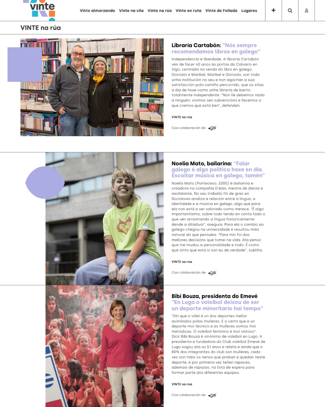 Vinte na rúa é o espazo no que, dende a primavera de 2024, a revista VINTE nos achega a historias de xente coa que nos cruzamos a diario e que merecen ser contadas. Neste tempo virou en espello da vida cotiá de vilas e cidades galegas a través da ollada da súa veciñanza.