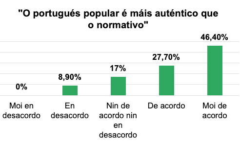 En segundo lugar, preguntouse pola autenticidade da fala popular, definida como o uso informal ou espontáneo da lingua. Ao 53,3 por cento de galegofalantes e ao 74,1 por cento de lusofalantes resúltalles máis auténtica do que a variedade normativa. Esta impresión é maioritaria no caso galego, pero só lixeiramente, xa que un de cada catro informantes mostrou indecisión ao respecto. En cambio, si parece unha visión máis predominante entre os falantes de portugués, aos que tamén se lles pediu sinalar aquilo que mellor representa o “auténtico portugués brasileiro”. A opción máis votada foi unha canción do xénero Funk (posiblemente, o menos normativo do panorama musical) e o 62,6 por cento indicou exemplos de linguaxe informal. En liñas xerais, os participantes asocian a fala popular co concepto de autenticidade e pensan que representa mellor o seu idioma do que o estándar, especialmente os brasileiros.