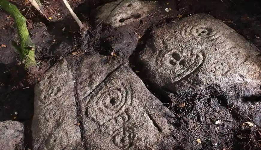 Atopáronse no monte do lugar Trasouteiro. Os gravados están distribuídos en nove paneis cun gran repertorio de motivos iconográficos propios do Grupo Galaico da Arte Atlántica, xeométricos ou circulares con coviñas e aneis, ademais dunha espiral inscrita nun anel que é unha das poucas existentes nesta zona. Polos análises dos investigadores a súa cronoloxía é duns 4.500 anos.