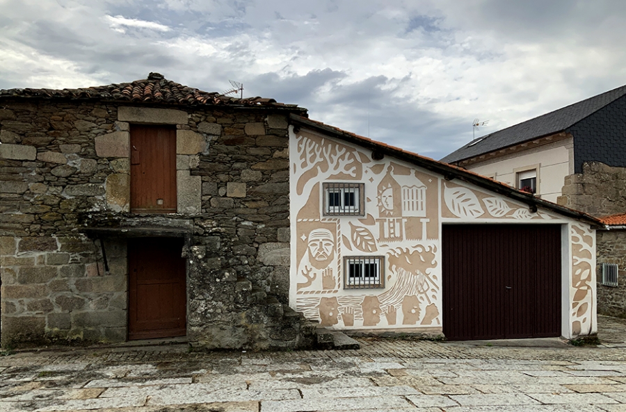 No ano 2017 Miguel Peralta e Xoana Almar (Cestola) deseñaron este mural nunha vivenda da Praza da Torre de Castro Caldelas, finalmente executado tamén por Carola Sánchez e Xavier Bernández, dous expertos na técnica. Foi unha actuación que supuxo retomar a técnica tradicional do esgrafiado dándolle un valor engadido e contemporáneo, a combinación co muralismo. Este traballo forma parte dun conxunto de intervencións promovidas polo Consorcio de Turismo da Ribeira Sacra.