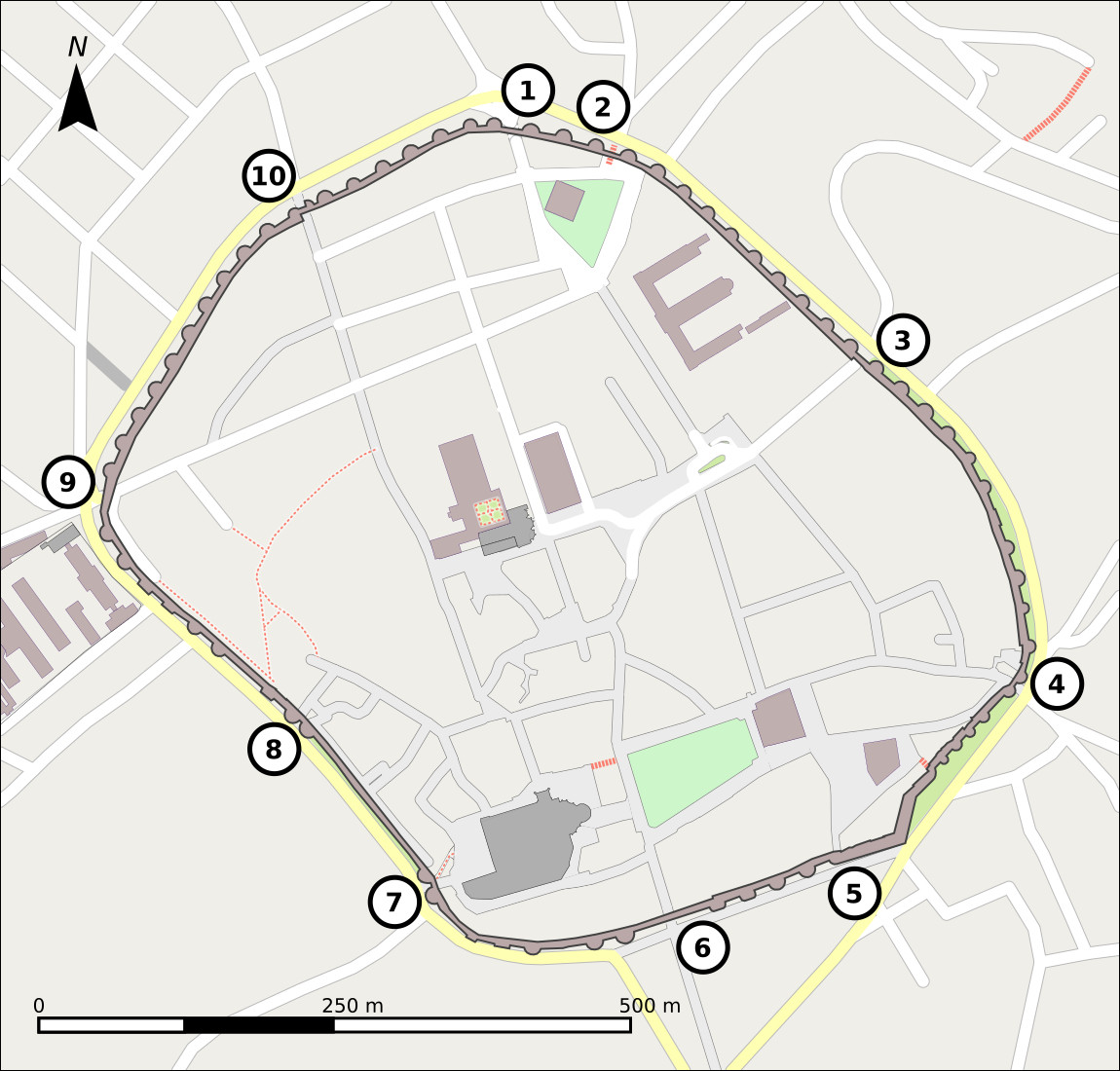 Orixinalmente, a muralla contaba con cinco portas (as actuais Porta Miñá, Porta Falsa, Porta de San Pedro, Porta Nova e Porta de Santiago) que coincidían coas principais vías de acceso. Entre 1853 e 1921 abríronse outras cinco: San Fernando (1853), da Estación (1875), Bispo Izquierdo, do Campo Castelo ou do Cárcere (1888), Bispo Aguirre (1894) e Bispo Odoario ou do Hospital (1921).