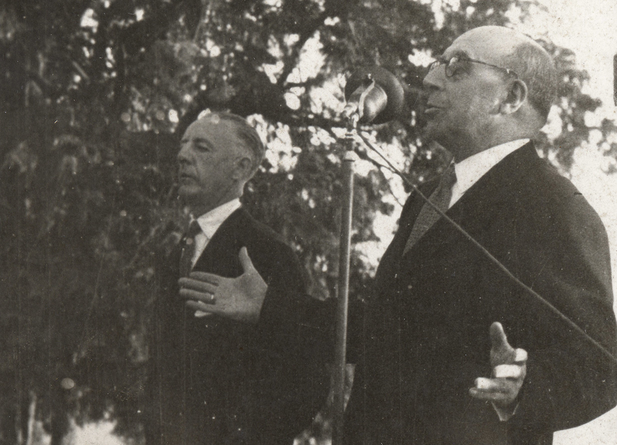 Recibimento de Pere Comas, en nome da Generalitat de Catalunya, aos deputados galegos Castelao e Ramón Otero Pedrayo o 20 de xullo de 1931. Fotografía tomada na parada do Paseo de Gracia.