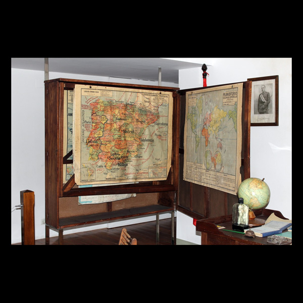 En 1950 o mestre Celso Currás, da escola de Trabada, deseñou este trebello, orixinal e único, coa finalidade de ter arquivados nun reducido espazo da aula os mapas necesarios para desenvolver o seu labor docente.