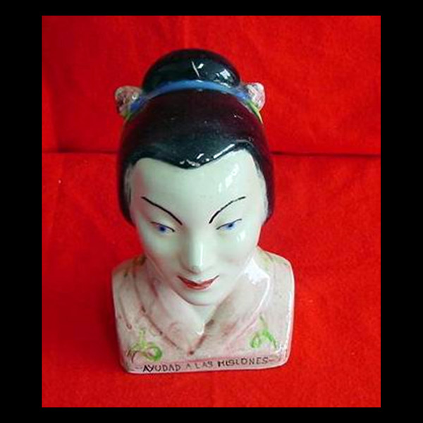 Este peto de esmolas procede da década dos 40 e representa unha muller oriental, animando a ofrece algunhas moedas destinadas á Igrexa Católica e ás súas misións. Os petos para o Domund (acrónimo de “Domingo Mundial das Misións”, xornada que se celebra desde o ano 1926) empregábanse para recoller axudas económicas para soster a labor misioneira da igrexa católica por todo o mundo.