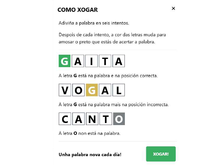 obxectivo é adiviñar unha palabra de cinco letras en ata seis intentos. Dende xaneiro de 2022, pódese xogar en galegoO xogo destaca pola súa sinxeleza e polo desafío diario compartido: todos os xogadores tentan a mesma palabra no día. Isto propiciou que o xogo se viralizase e que se crease unha comunidade global que comparte os seus resultados nas redes sociais.