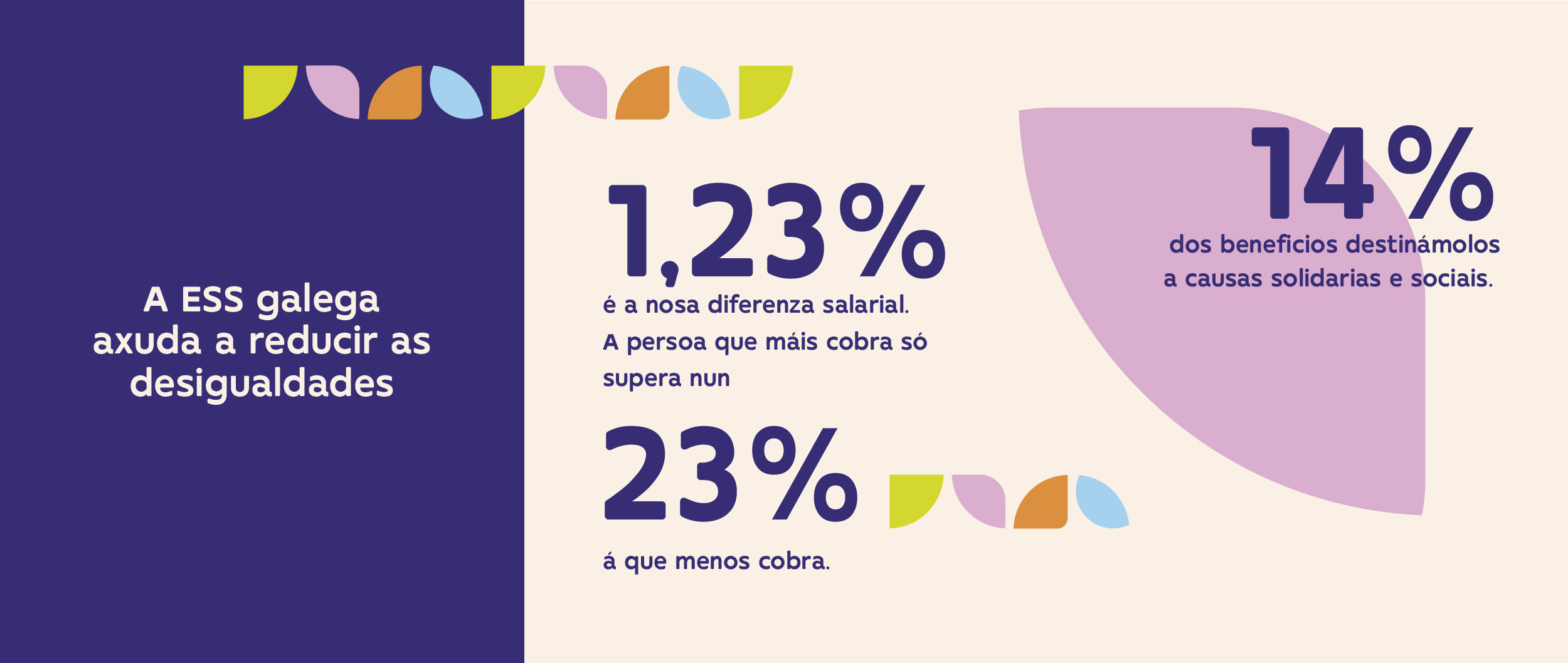 A diferenza salarial interna sitúase nun 1,23; o que significa que a persoa que máis cobra supera nun 23% á que menos cobra, unha cifra moi afastada das dinámicas habituais no ámbito laboral. Ademais, as entidades destinan de media un 14% dos seus beneficios a causas sociais e solidarias, reforzando o compromiso coa redistribución da riqueza.