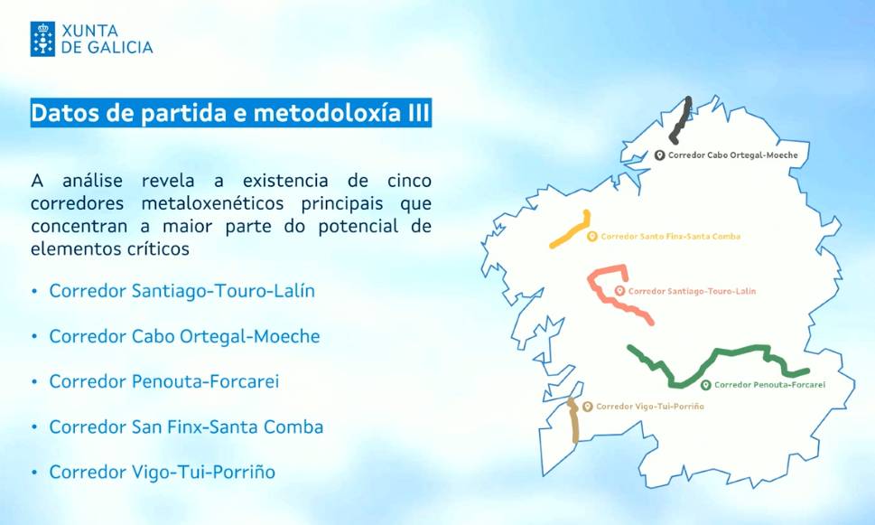 Hai catro anos a Xunta publicitou a existencia dun "informe sobre o potencial mineiro de materias primas críticas en Galicia" cuxo contido mantivo en segredo co argumento de que podería dar pé a "movementos especulativos". Este luns o Goberno galego volveu publicitar as conclusións dun novo estudo sobre a presenza no país de minerais que a Unión Europea considera críticos e estratéxicos. E desta volta si fixo públicas as zonas nas que estarían eses materiais, repartidos en cinco grandes "corredores".