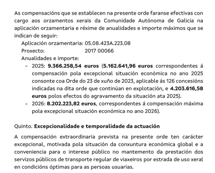 O pasado luns, 13 de outubro, o conselleiro de Presidencia, Diego Calvo, con competencias en Mobilidade, asinou unha Orde pola que vai repartir ata 17,5 millóns de euros en axudas ás 127 concesionarias de liñas de bus competencia da Xunta. Faino pola "situación de excepcionalidade económica" que segundo o Goberno galego segue afectando a ese sector, que vén recibindo millonarias axudas autonómicas desde a pandemia e a guerra de Ucraína ao tempo que a Xunta sanciona algúns dos seus incumprimentos e admite que calculou mal varias desas concesións.