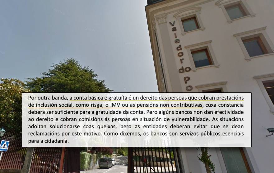 Feitos como este veñen sendo denunciados de xeito recorrente pola Valedora do Pobo. No seu último informe anual, feito público en novembro, a Valedora lembrou que "a conta básica e gratuíta é un dereito das persoas que cobran prestacións de inclusión social, como a Risga, o IMV ou as pensións non contributivas, cuxa constancia debera ser suficiente para a gratuidade da conta". "Pero algúns bancos non dan efectividade ao dereito e cobran comisións ás persoas en situación de vulnerabilidade", engade a Valedora, que sinala que "as situacións adoitan solucionarse coas queixas, pero as entidades deberan evitar que se dean reclamacións por este motivo".
