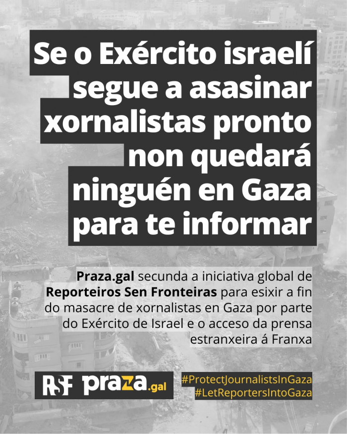 O pasado 1 de setembro Praza.gal e a nosa editora, a Fundación Praza Pública, secundou a iniciativa global de Reporteiros Sen Fronteiras para esixir a fin do masacre de xornalistas en Gaza por parte de Israel e o acceso da prensa estranxeira á Franxa.