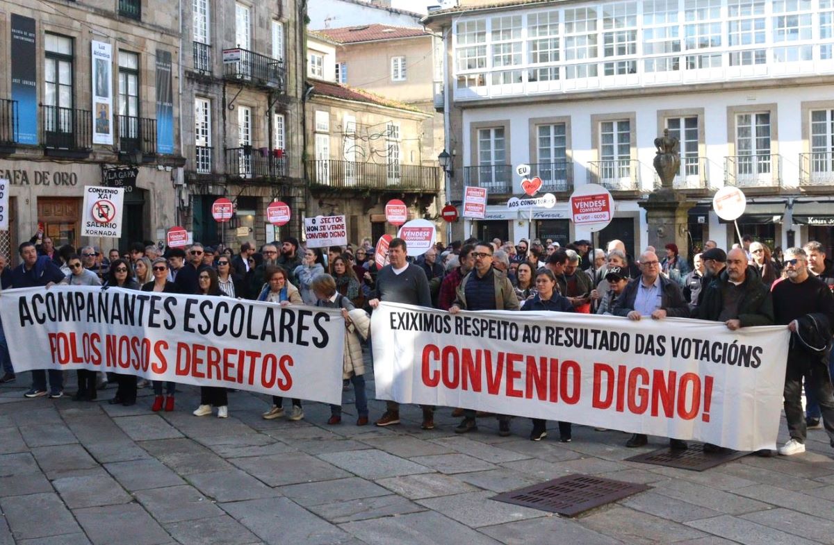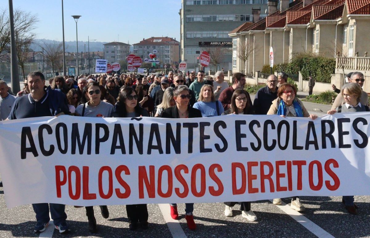 Na manifestación, o persoal acompañante do transporte escolar portaba tamén a súa propia faixa demandado avances nas condicións de traballo, que denuncian que están "altamente precarizadas" e que aínda "empeoran con este acordo", tal e como denunciou, Nieves Paz, ao remate da protesta.
