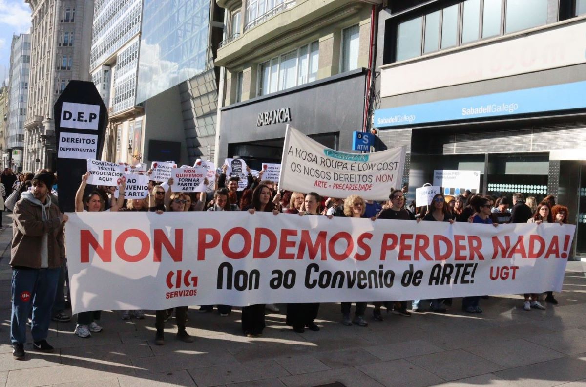 Segundo os sindicatos convocantes, ata o 90% do persoal do sector, que suma unhas 2.500 traballadoras, secundaron a folga contra o convenio que, din, "pretende impor" a patronal ARTE, integrada polas grandes compañías como Inditex, Mango, H&M, Primark, Cortefiel, Bimba&Lola, Uniqlo, Punt Roma, Mayoral, e que empeoraría as condicións do convenio provincial en vigor que remata a súa vixencia no final deste ano.