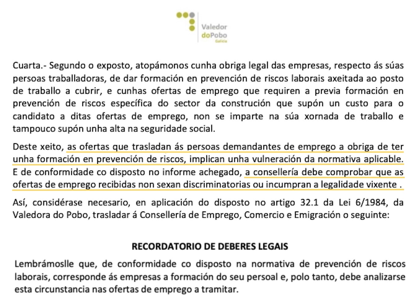 A resolución da Valedora di que no caso denunciado "atopámonos cunha obriga legal das empresas, respecto ás súas persoas traballadoras, de dar formación en prevención de riscos laborais axeitada ao posto de traballo a cubrir, e cunhas ofertas de emprego que requiren a previa formación en prevención de riscos específica do sector da construción que supón un custo para o candidato a ditas ofertas de emprego, non se imparte na súa xornada de traballo e tampouco supón unha alta na seguridade social".