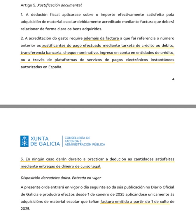 Por último, a Orde sinala expresamente que será de aplicación "ás adquisicións de material escolar que teñan factura emitida a partir do 1 de xullo de 2025".