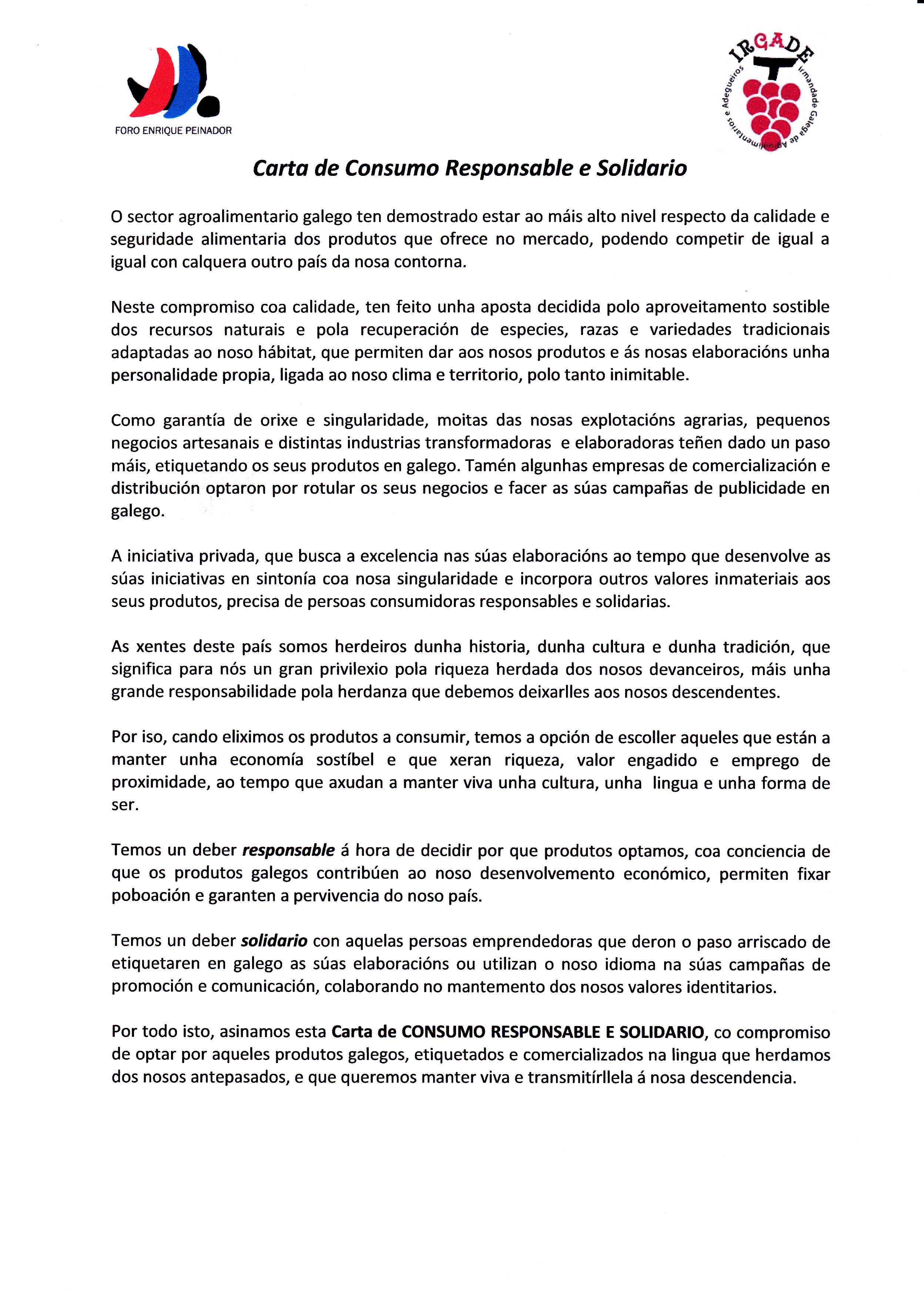 Na Carta recóllese o compromiso das institucións coa calidade e o aproveitamento sostible dos recursos naturais, así como pola recuperación de especies, razas e variedades tradicionais adaptadas ao noso hábitat, que permiten dar aos produtos galegos unha personalidade propia. Neste documento contémplase tamén o deber responsable á hora de decidir que produtos se consumirán, coa conciencia de que os produtos galegos contribúen ao desenvolvemento económico, permiten fixar poboación e garanten a pervivencia do noso país. Así mesmo, inclúese o deber solidario con aquelas persoas emprendedoras que deron o paso de etiquetar en galego as súas elaboracións ou que usan a nosa lingua nas súas campañas de promoción e comunicación.
